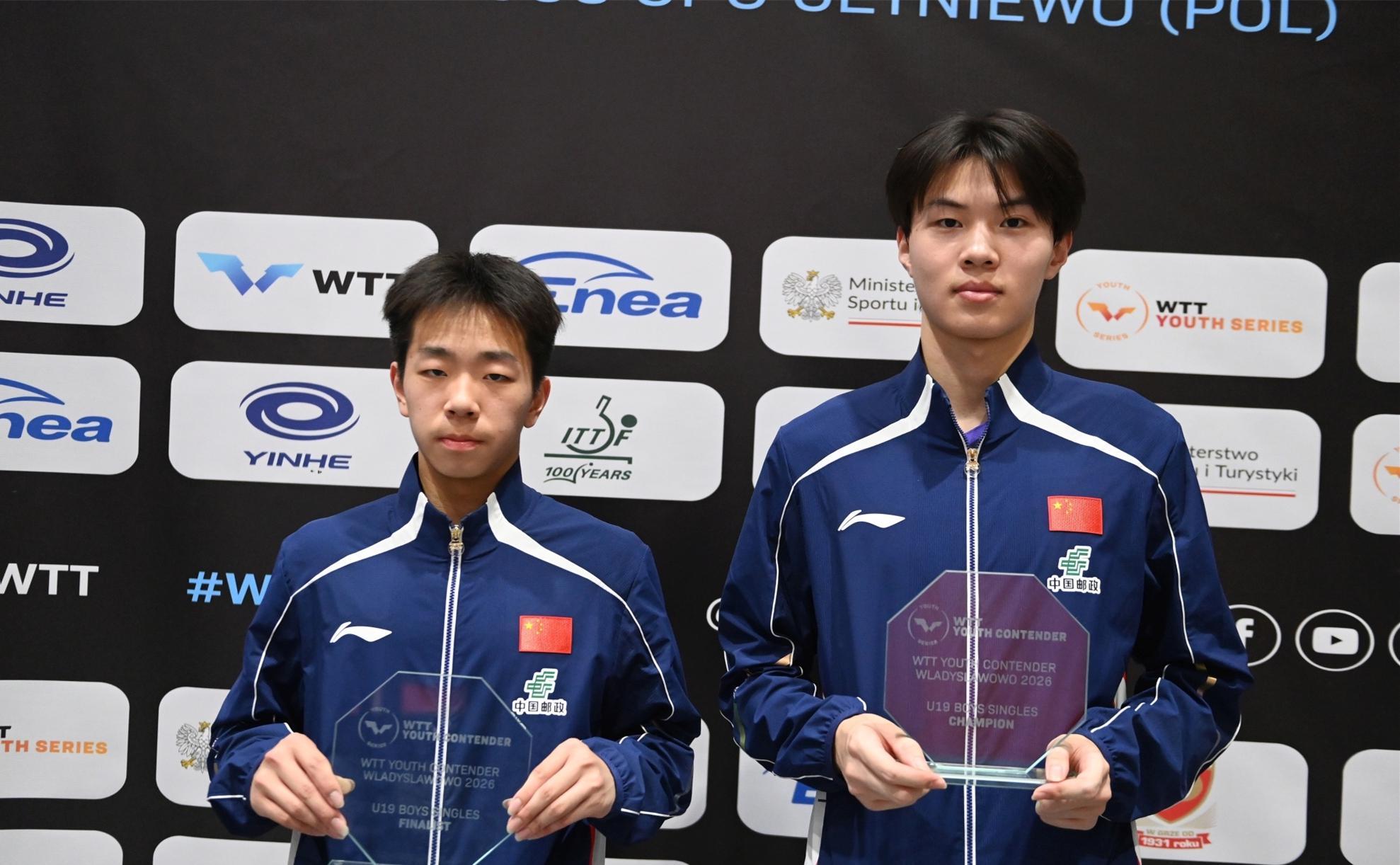 伍毅菲和唐乙仁连续3站比赛都实现了在U17组会师决赛,两人包揽了这个组别的冠亚军。3月6日的弗瓦迪斯瓦沃沃站U17男单决赛,伍毅菲3比0击败唐乙仁夺冠。3月11日的柏林站U17男单决赛,唐乙仁3比2险胜伍毅菲夺冠,其中决胜局打出12比10的比分。如今在哈维若夫站,伍毅菲又夺得了一个冠军。