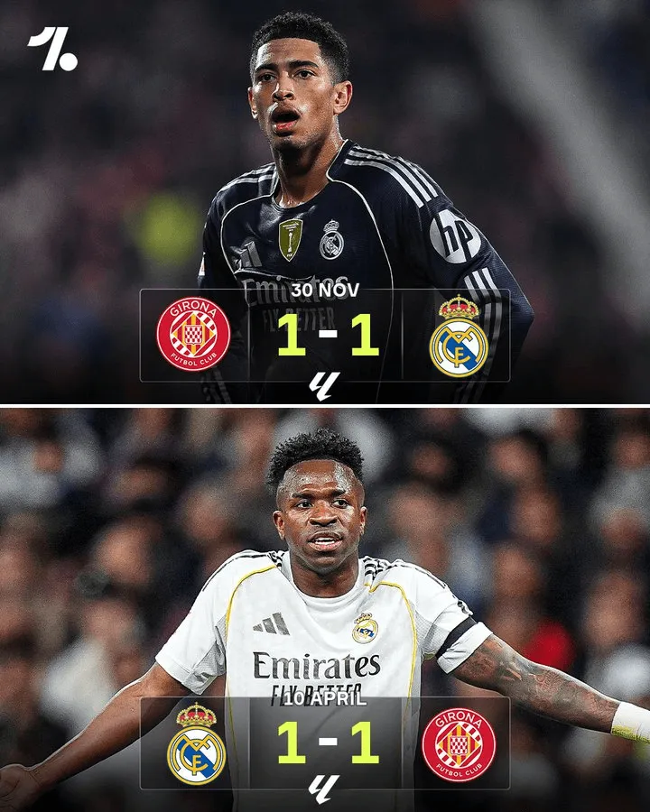 根据One Football的数据统计,皇家马德里本赛季在联赛中两次对阵吉罗纳均战成1-1平,一共在这支球队身上丢掉了4分。