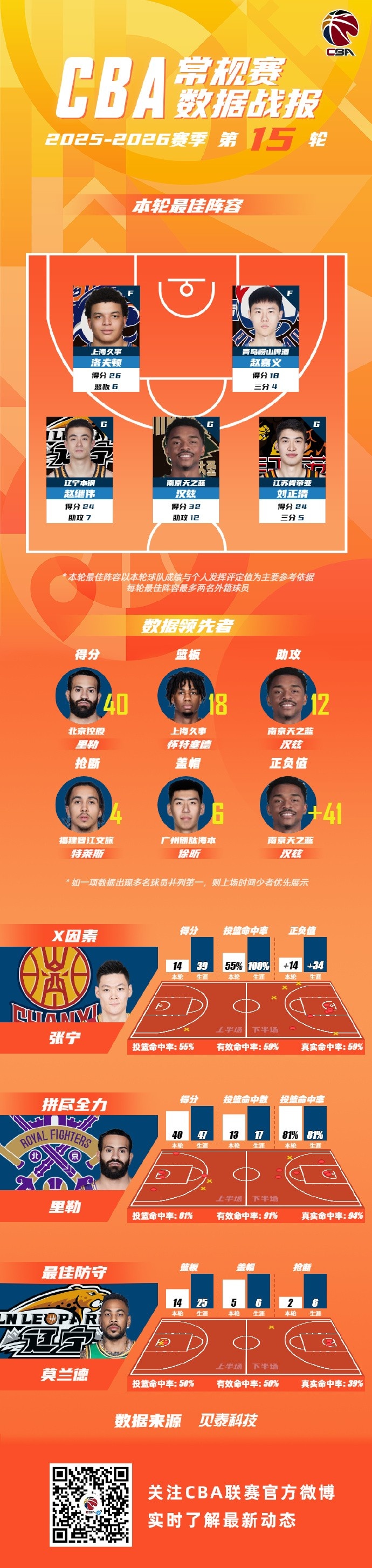 数据领先者方面:北京控股篮球俱乐部球员里勒以单场40分的数据领衔得分榜;